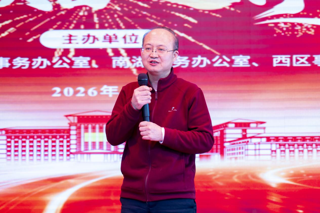 瑞雪迎春至,骏马载鸿程。为增进交流协作,凝聚发展合力,激发团结奋进精神,2026年1月13日,校区事务办公室在中心校区莘子园教工餐厅联合举办“同心协力逐梦 欢歌奋进前行”新年联欢会。校党委常委、副校长张国兴参加活动。